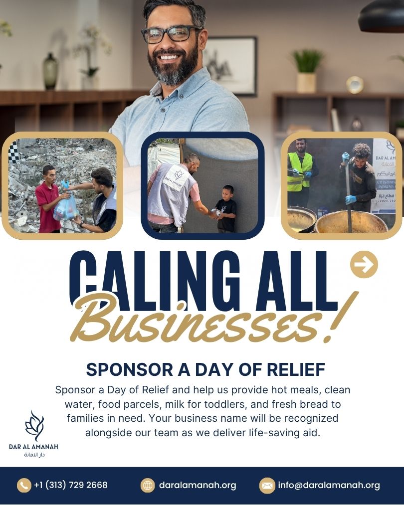 If you’re a business owner looking to make a meaningful difference, sponsor a Day of Relief with Dar Al Amanah. Together, we can bring food, water, and care to families who need it most.